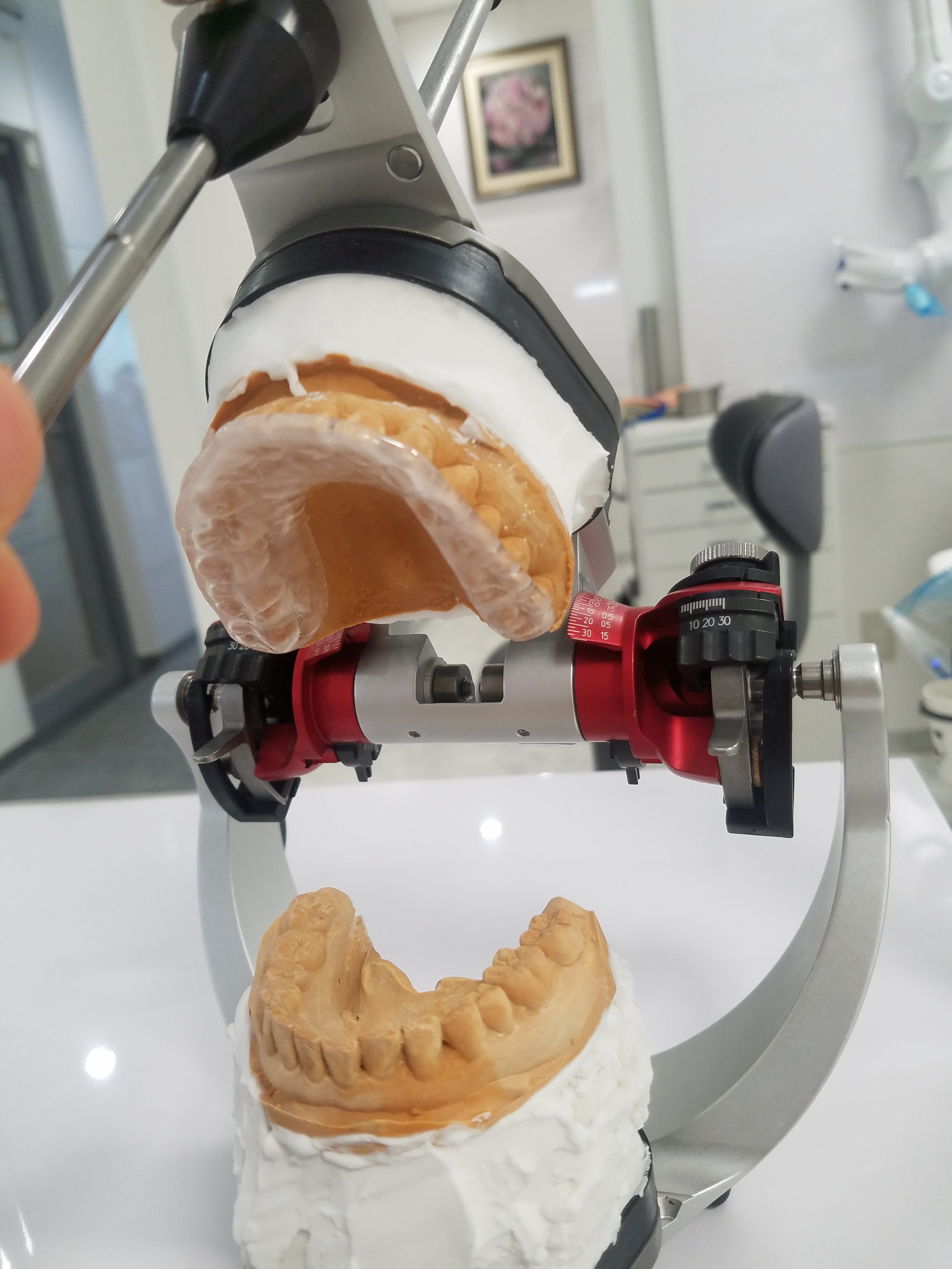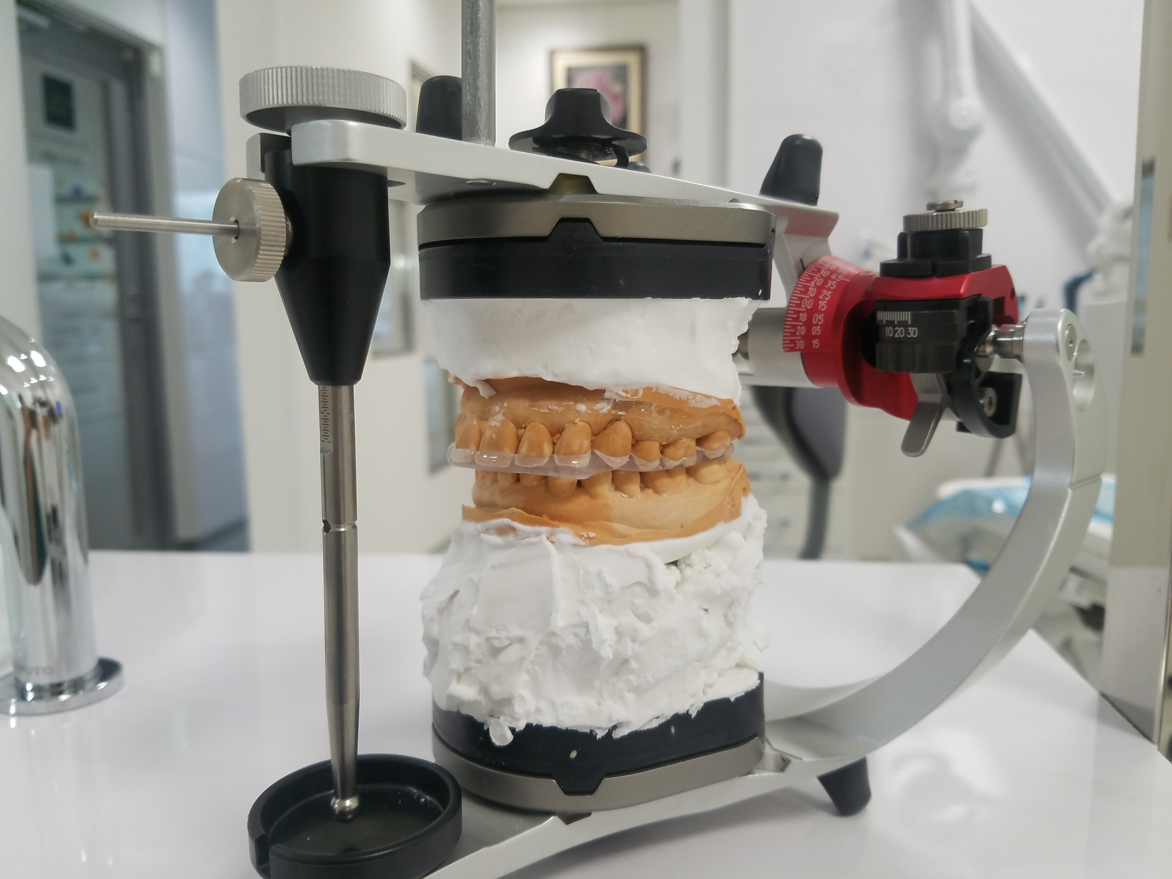 完成したスプリントです。咬合器に装着して噛み合わせを合わせて作ります。