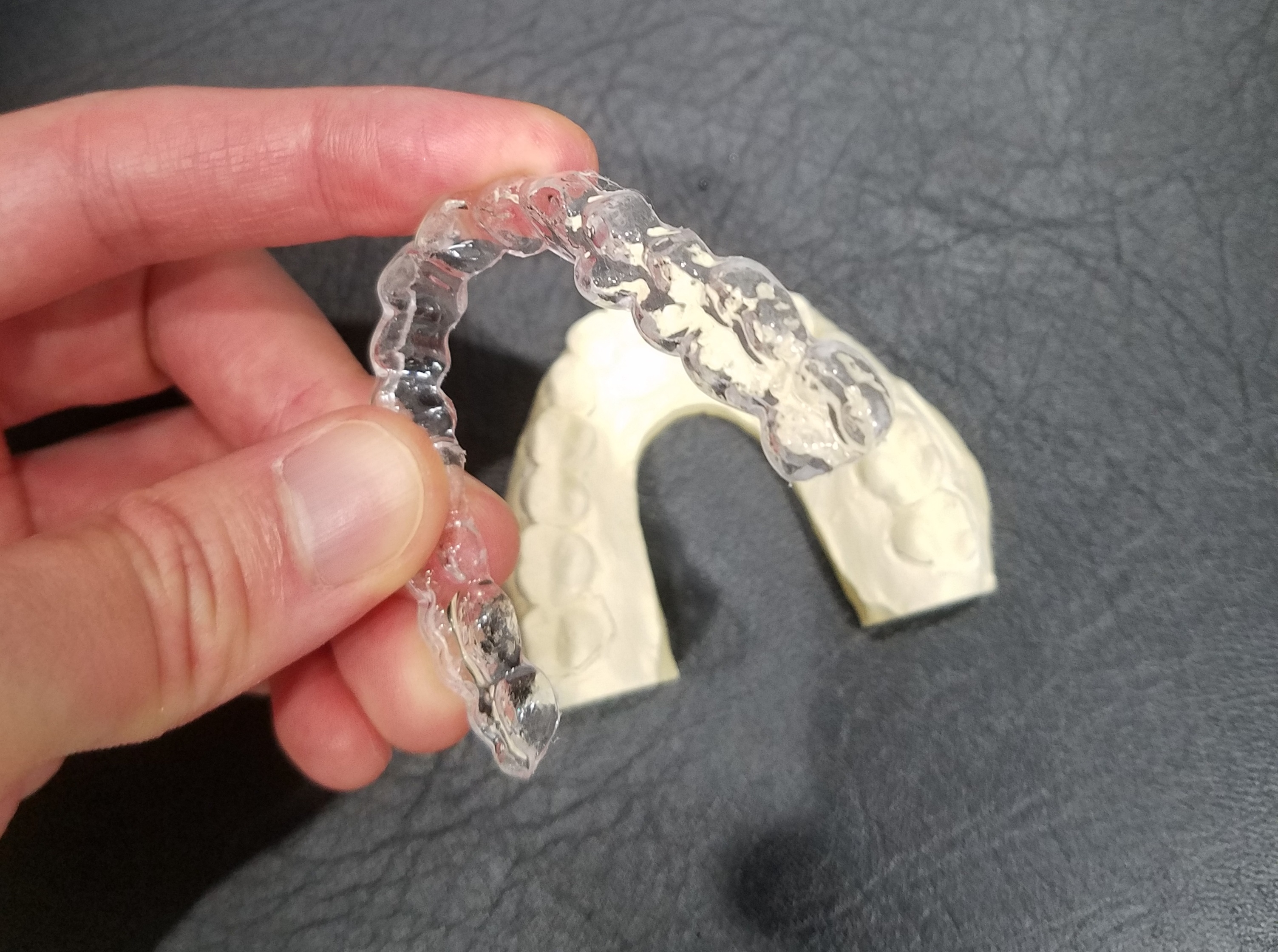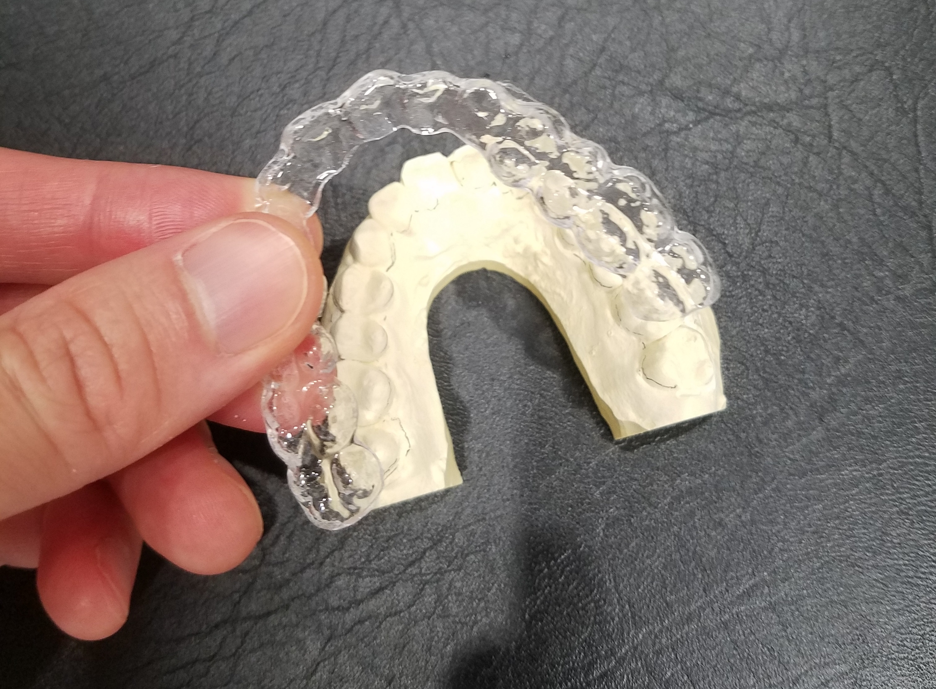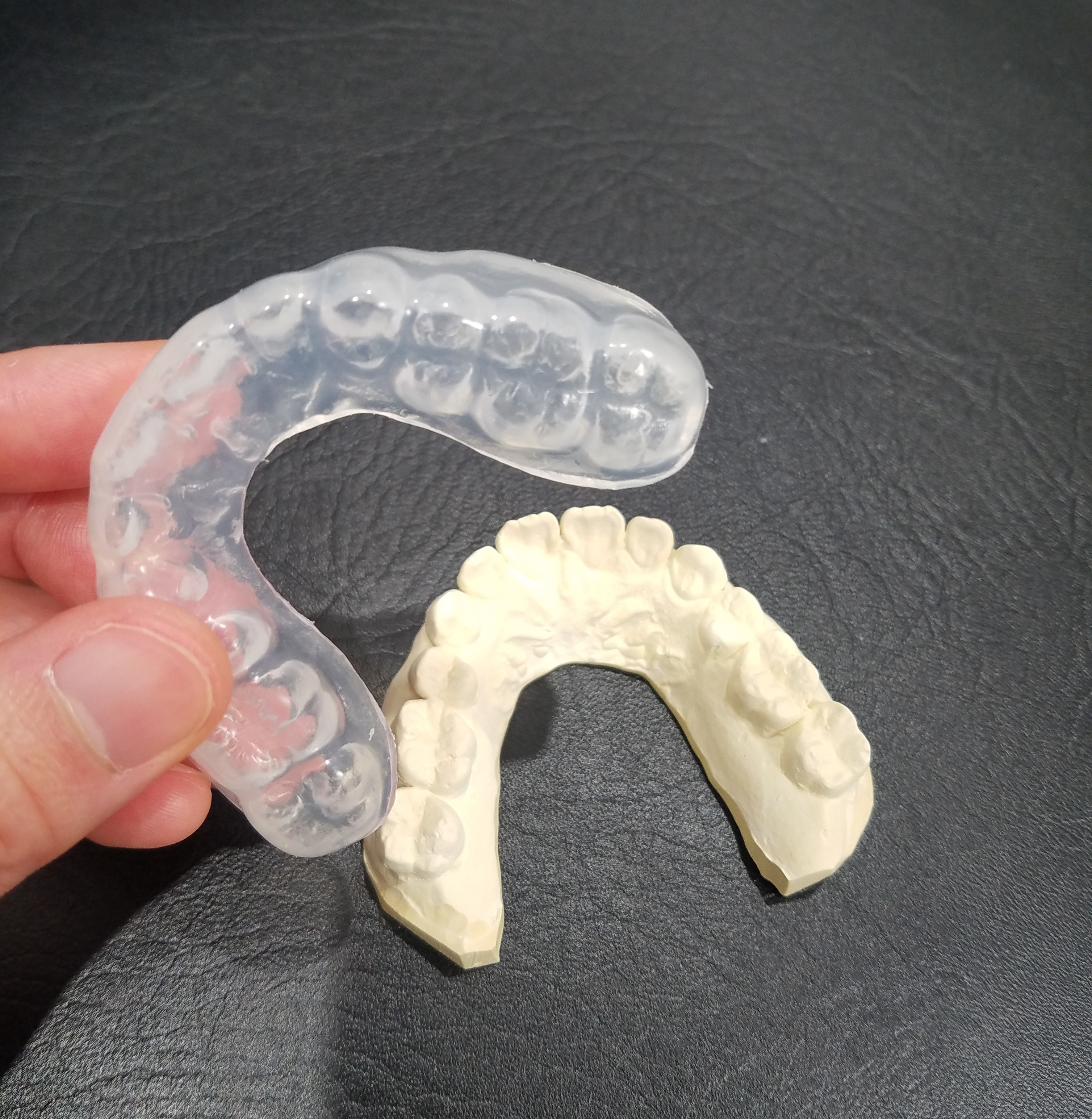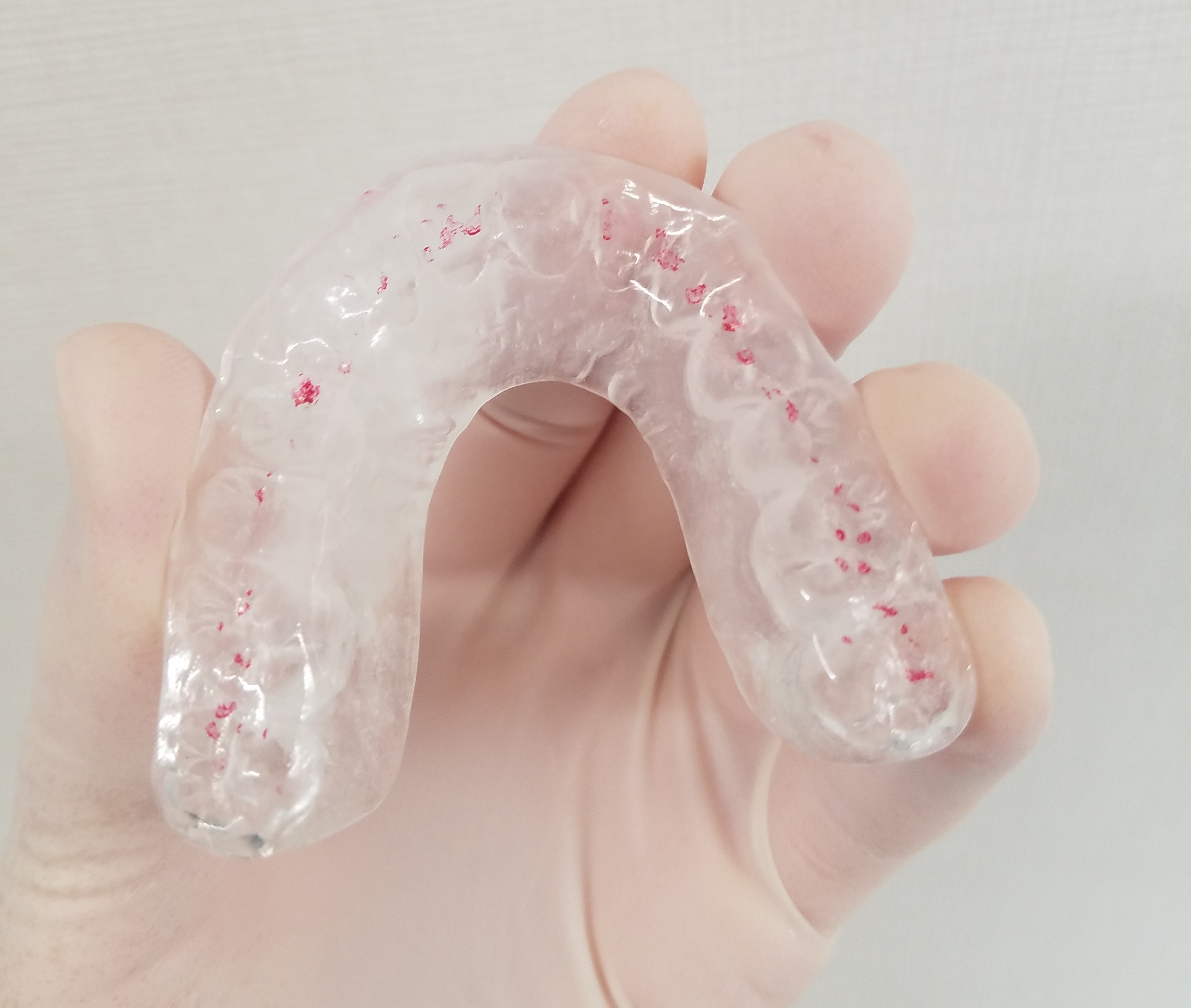 厚さ1mm~2mmくらいの柔らかいタイプです。シリコン用の素材を使い、患者さんの歯型に合わせて作ります。