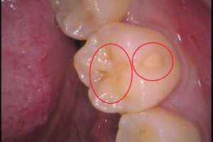 赤丸で囲まれた場所の内部に虫歯があります。