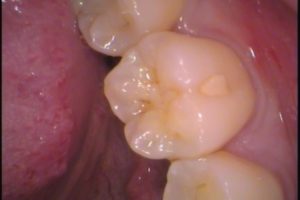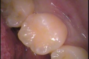 20代男性、左下奥歯に古いレジン(プラスティック樹脂)のつめ物があります。