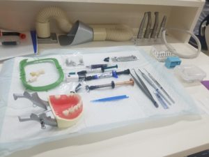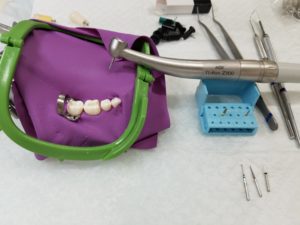 歯の模型を使って、詰め物や、形を整える練習を行います。