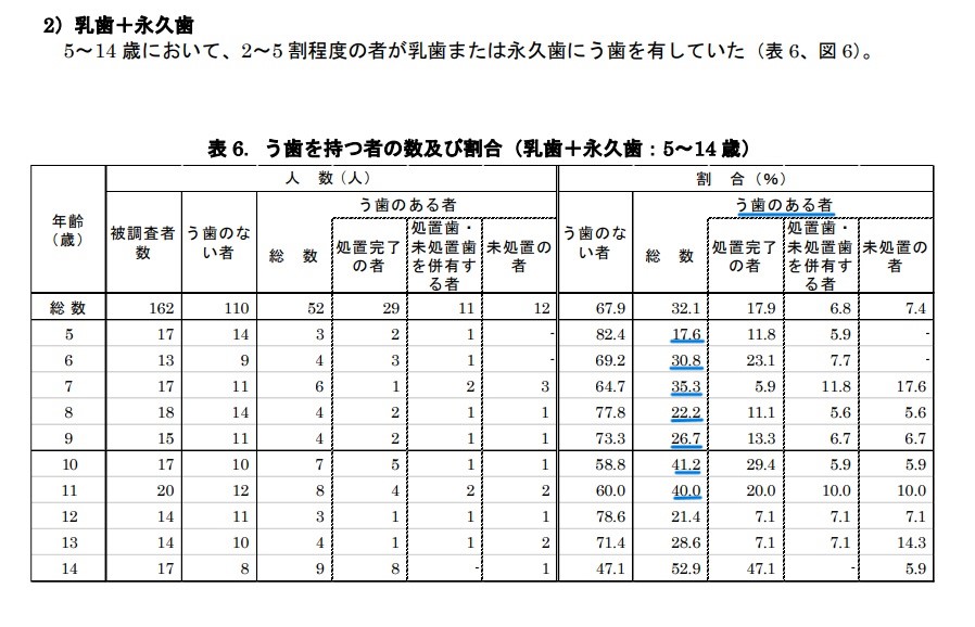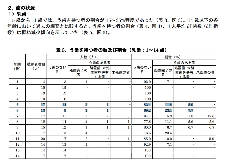6歳から永久歯といって大人の歯が生えてきますが、例えば、子供の歯の乳歯が全て生えそろっている5歳児の統計を見てみると、