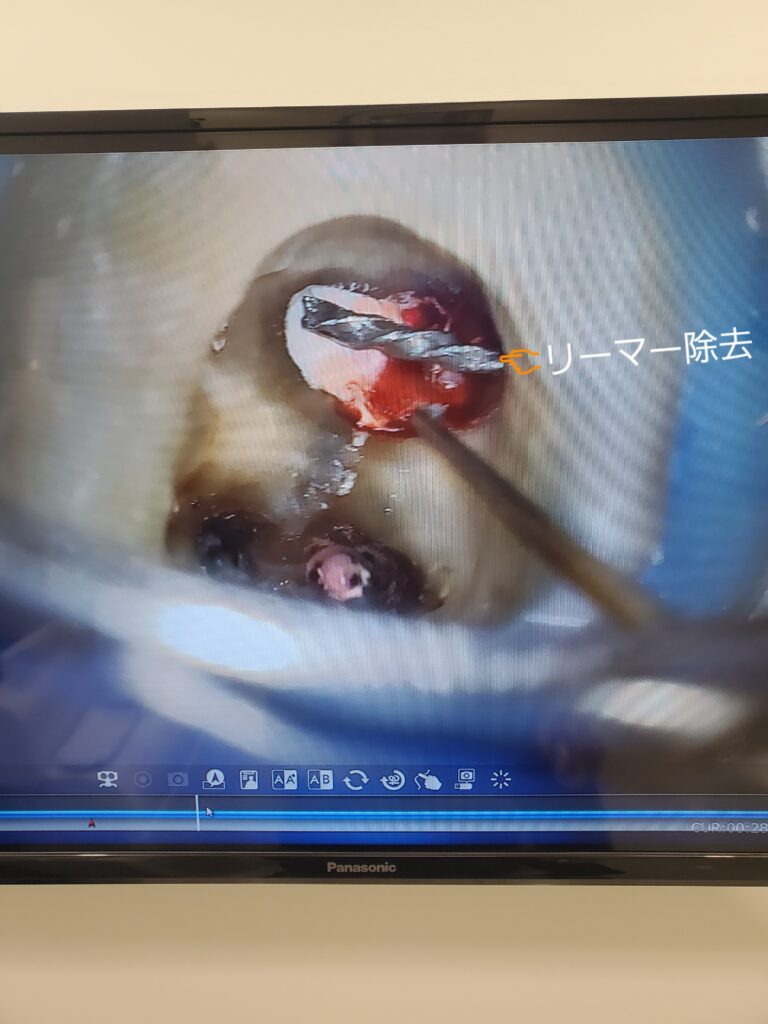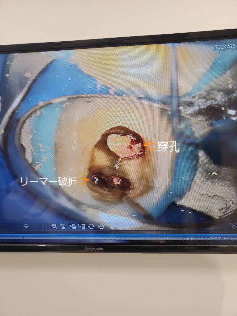 治療に使った器具のリーマーが折れて残っている(リーマー破折)のと、根管内で誤って削りすぎて、穿孔(パーフォレーション)といって穴が空いています。