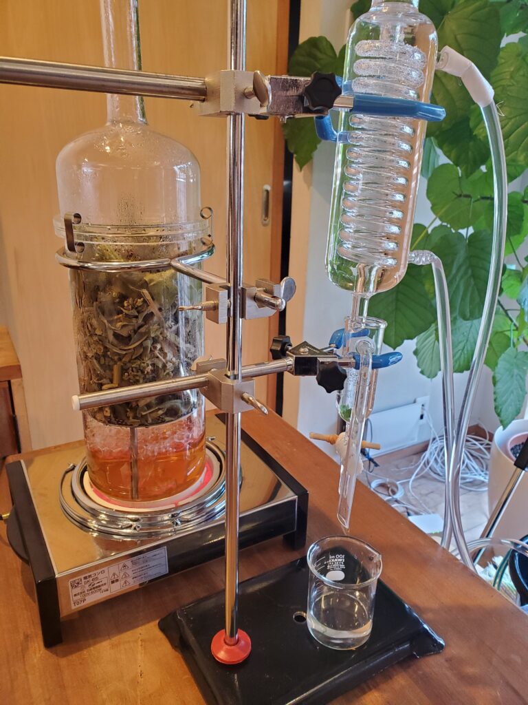 ホワイトセージを蒸留し、アロマウォーターを作ります。