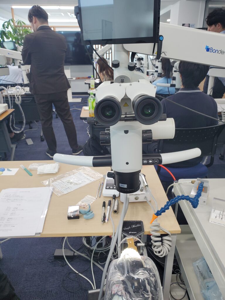 マイクロスコープ(歯科用顕微鏡)を使い、精密な治療のトレーニングです。