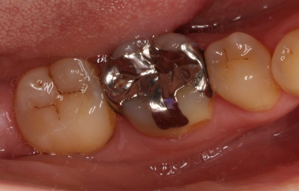 最初の状態です。奥歯に大きな銀歯が入っており、外れた影響もあり、歯と合っていません。浮いてついている感じです。(レントゲン検査で内部を確認済み)
