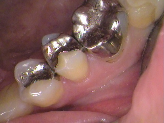 銀歯が入っている歯が3本。特に右側の6番目の歯には、大きな銀歯が入っています。