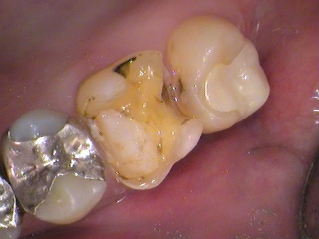 奥の歯は、ジルコニアのインレーが入っており、1年前に他の歯医者で治療したようです。虫歯が残っていますね(-_-;)