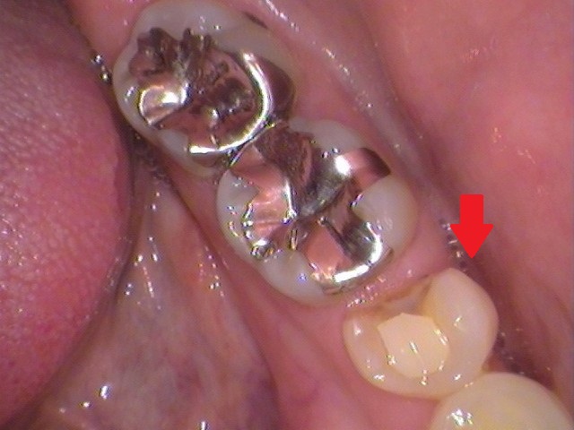 奥歯が2本銀歯が入っており、手前の歯(矢印)が欠けています。