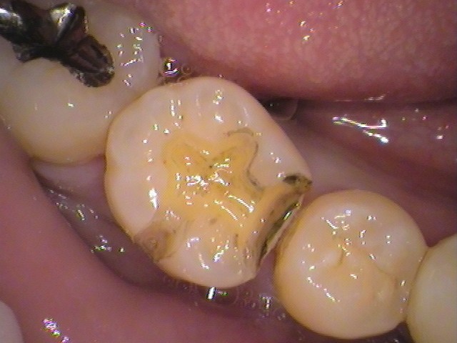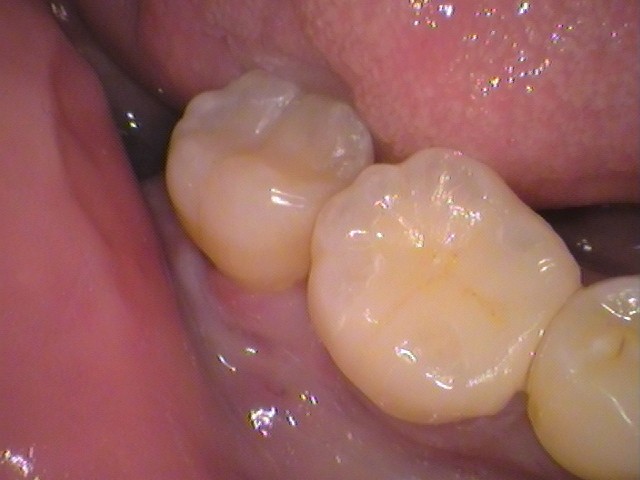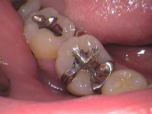 奥歯はダイレクトボンディング。銀歯を外し、レジンで詰めてあります。