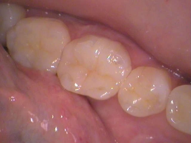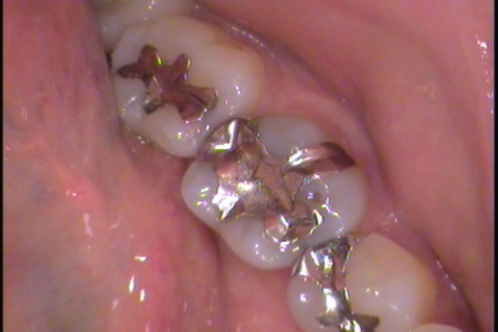 お口の中を見ると、左下奥歯に銀歯が目立ちます。