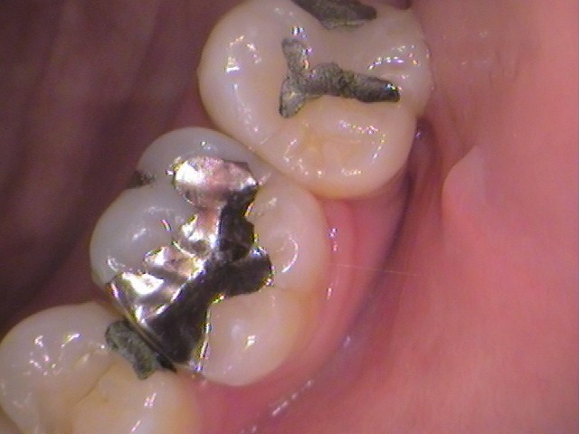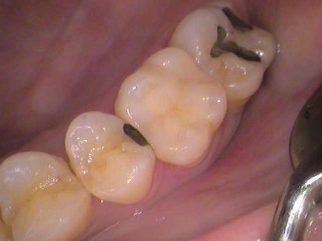 こちらは「アマルガム」という金属をしようしており、現在は保険で使用していない材料のため、20年以上前の治療ということがわかります。