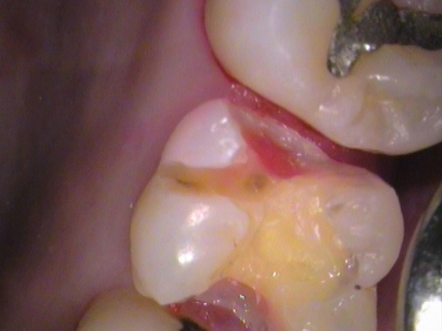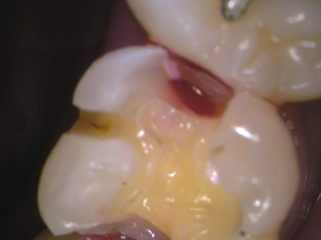 銀歯の直下はきれいなのですが、奥歯と接している内部に茶色い虫歯が出てきました。さらに削っていくと、