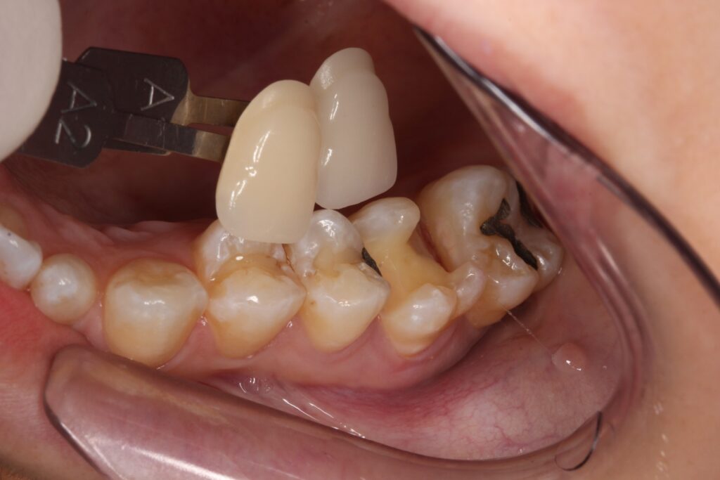 真ん中の歯はツヤ感があり、パラジウム合金をしようした、一般的な保険治療。