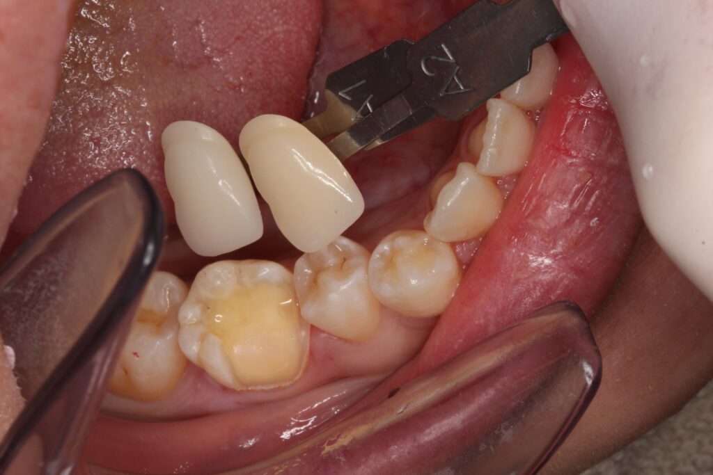 歯の色を記録します。色見本を元に、その方に合った歯の色を確認します。
