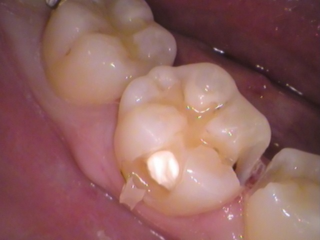 後日、出来上がったセラミックインレー(部分的な詰め物)をセットして、