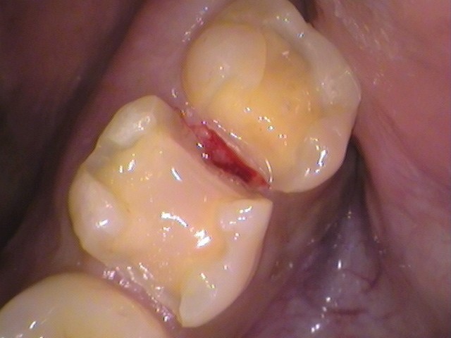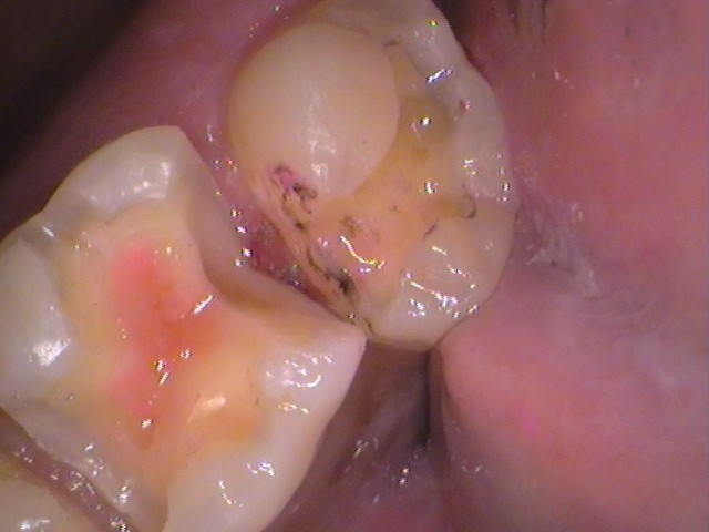 1つ奥の歯との間に黒い虫歯が見つかります。