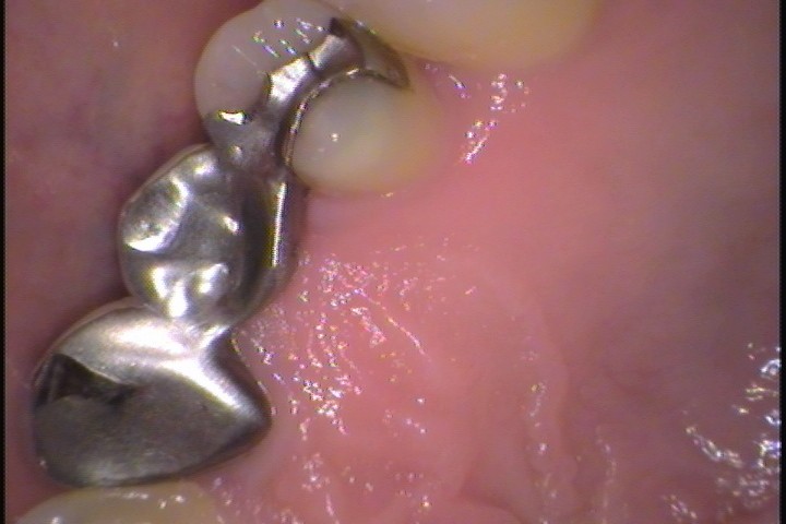 前の先生は、なるべく歯を削らないようにと、5番目の歯をかぶせ物(クラウン)ではなく、詰め物(インレー)でブリッジを設計しました。