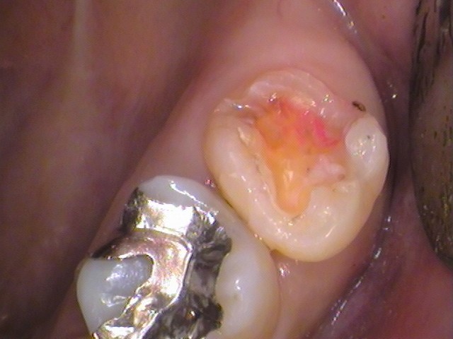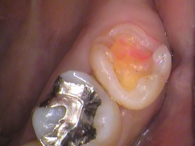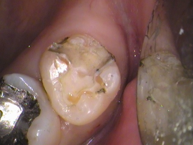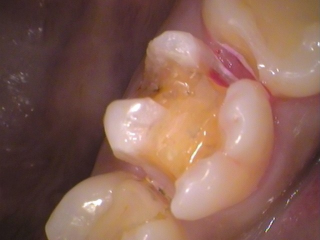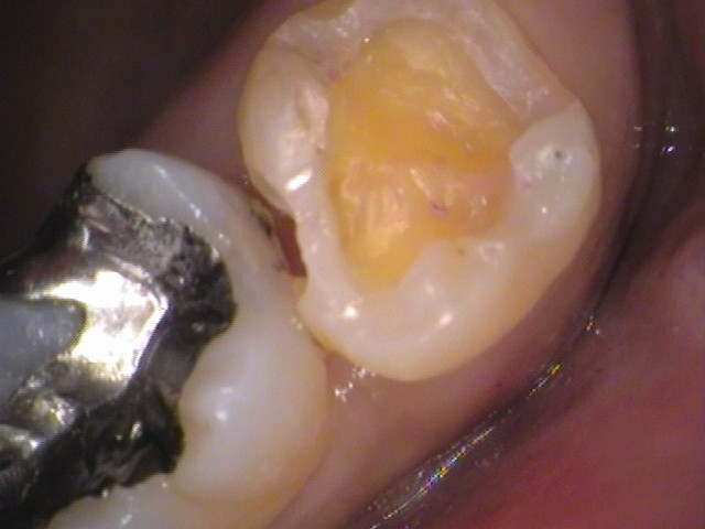 奥歯と接触していた箇所の内部に、染色された虫歯が確認できます。