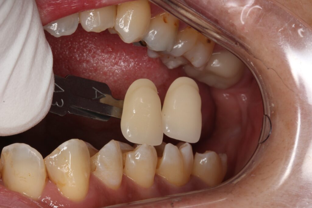 歯の色を記録し、型取りを行い、セラミックを作製し、