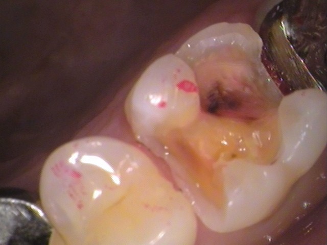内部で茶色いむし歯が広がっているのが分かります。