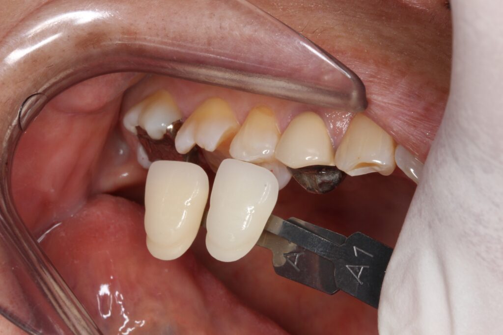 歯の色合わせを行い、歯に綺麗に合うようにセラミックを製作します。