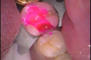 虫歯を染める薬(う蝕検知液)を使います。