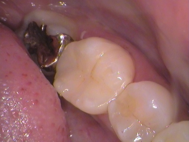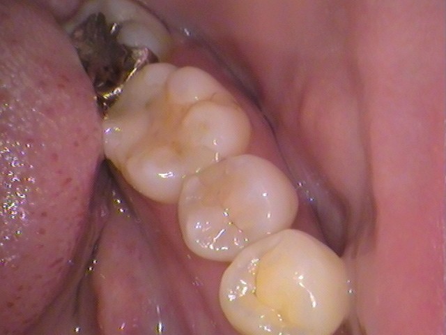 奥から、銀歯→レジン→レジンと、治療の跡があります。