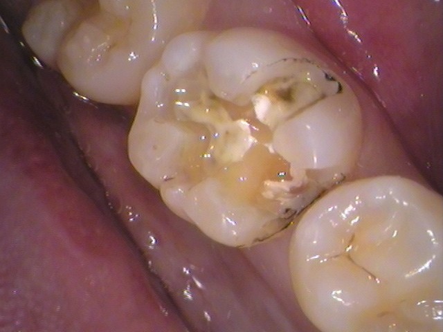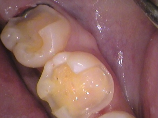噛み合う面に以前治療されたレジンが詰めてあり、