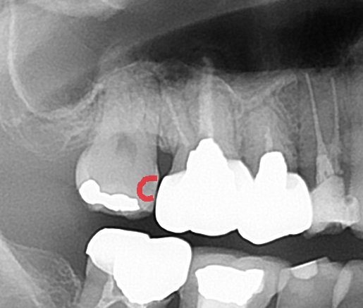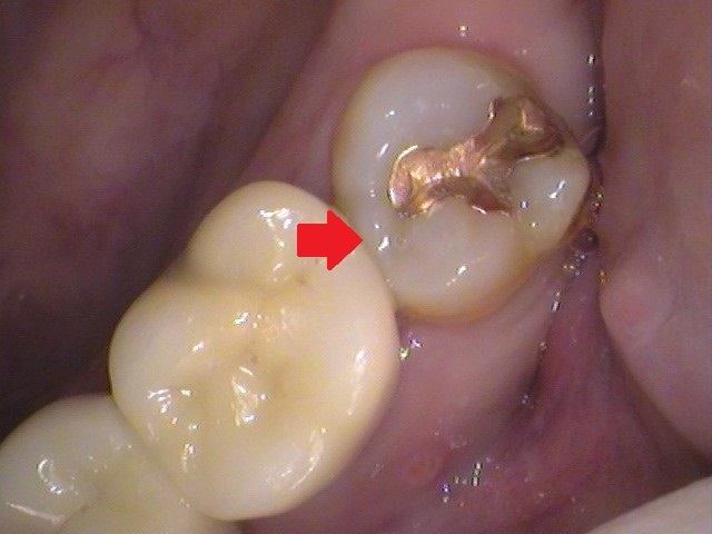 手前との間に、黒く虫歯の影が見えます。