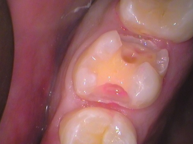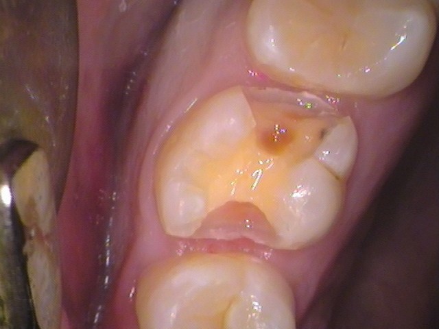セラミックがセットされた内部は茶色く虫歯が残っています。
