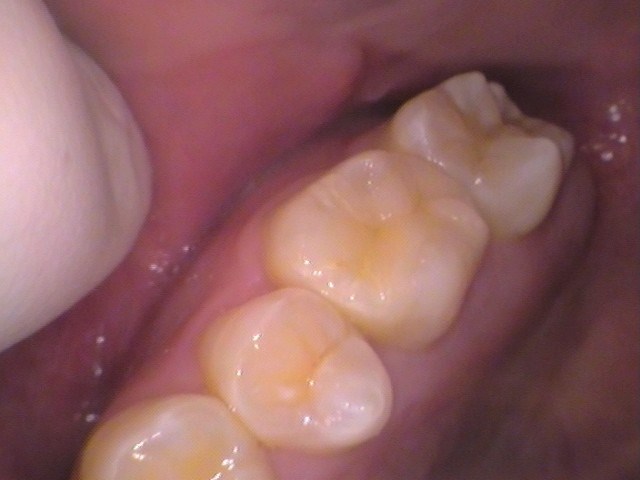 頬っぺた側から見てみると、セラミックと歯の接合部に黄色い付着物があります。