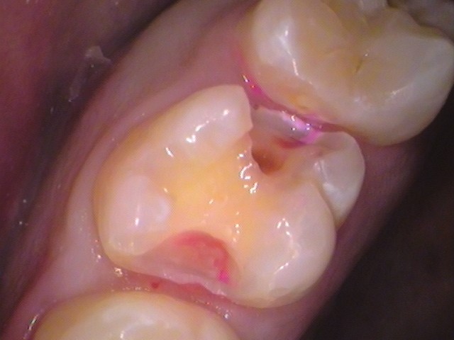 う蝕検知液を用いて、しっかりと丁寧に虫歯を取ります。