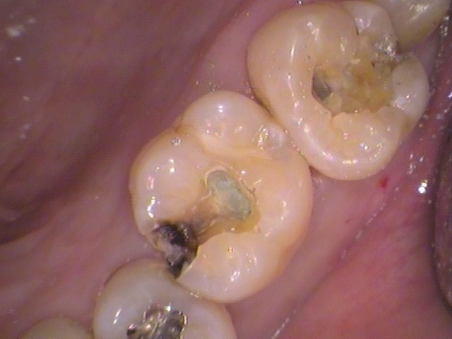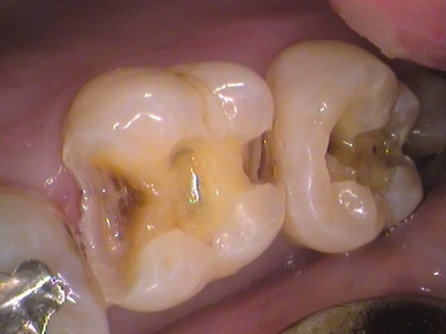 中に茶色い虫歯の侵入があります。