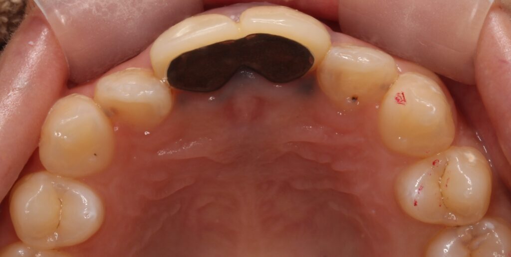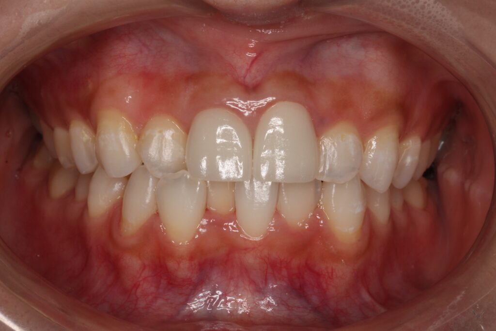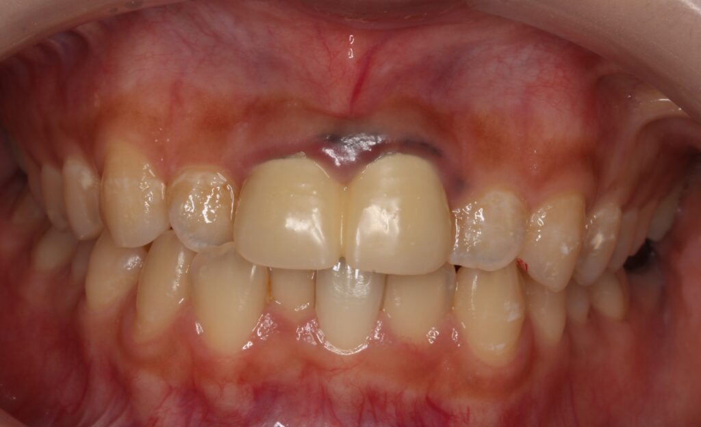 前歯2本にかぶせ物が入っており、その歯ぐきが黒く変色しています。