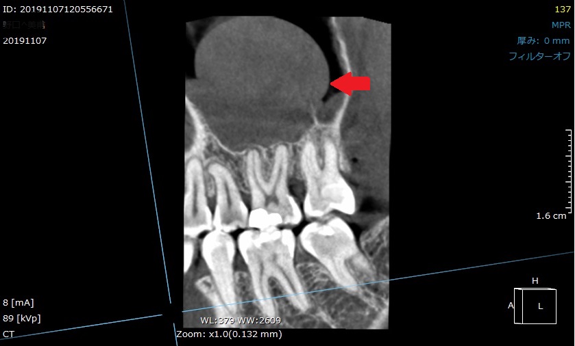 左上6番目の歯ですが、赤い矢印の部分が灰色に膨らんでいるのが分かりますでしょうか?