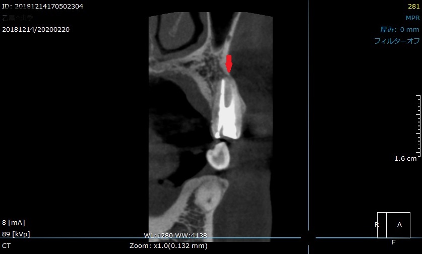 白いスジ(根管充填材料)が右側は見えるのですが、