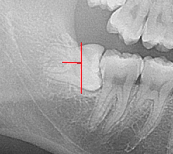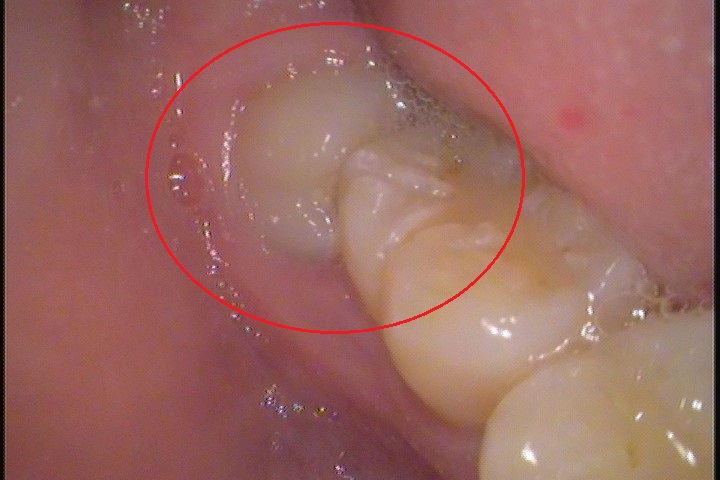 赤丸で囲まれた歯が親知らずです。歯の頭の部分が出ていますね。